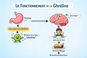La ghréline est une hormone produite lorsque notre estomac est vide ou lorsque notre corps nécessite de l’énergie suite à la baisse de la glycémie (sucre dans le sang).